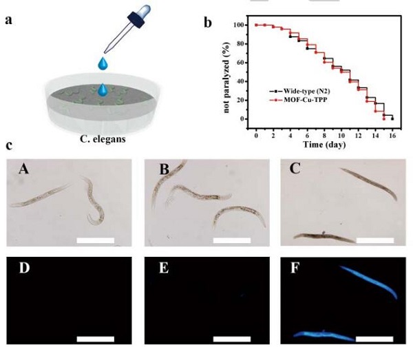(a) 设计的秀丽隐杆线虫中催化剂催化的点击反应示意图;