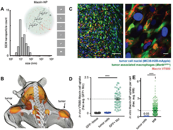 (E) MC38细胞及骨髓来源的巨噬细胞对VT680-Macrin的体外摄取情况。