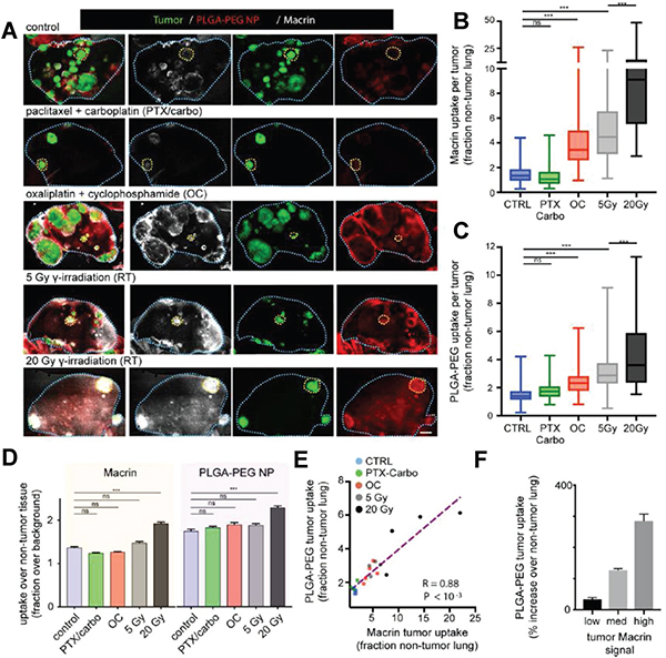 (E) 不同处理后,肿瘤对纳米颗粒摄取的相关性;