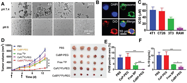 (A) 生理(pH 7.4)和酸性(pH 6)缓冲液中CaBP-PEG纳米颗粒的TEM图像;