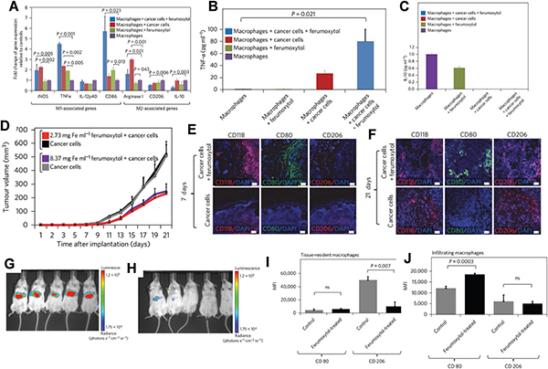 (B, C) 与癌细胞和Ferumoxytol共培养后,巨噬细胞TNF-α表达增加而IL-10分泌减少;