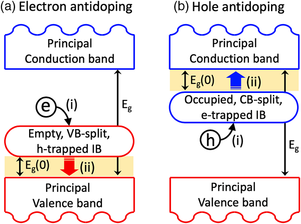 (a)电子反掺杂和(b)空穴反掺杂示意图。在掺杂到(a)中之前,化合物具有带俘获空穴的,从价带劈裂出来的未占据中间带,而在(b)中,它具有带俘获电子的占据的导带劈裂中间带。通过电子掺杂(a)(步骤i)导致电子-空穴复合,这导致中间带向价带(步骤ii)移动。这将造成未掺杂系统(橙色区域)的带隙Eg增加,从而降低电导率。(b)空穴反掺杂与之相似。