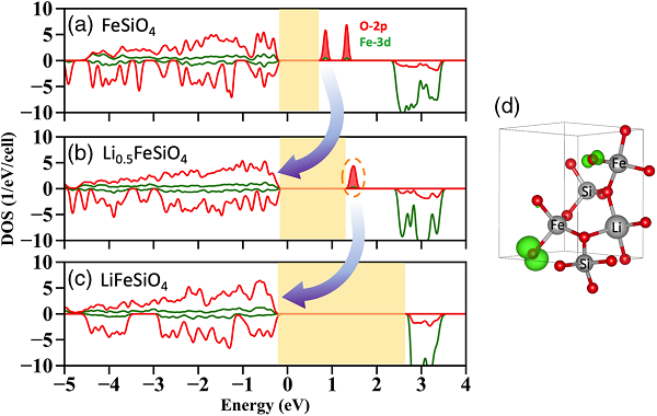 (a)FeSiO4 (b)Li0.5FeSiO4和(c)LiFeSiO4的态密度。箭头表示电子掺杂时中间带被价带吞并。(d)绿色等值面表示Li0.5FeSiO4中未占据的极化子中间带的波函数模平方,O原子用红色标记。