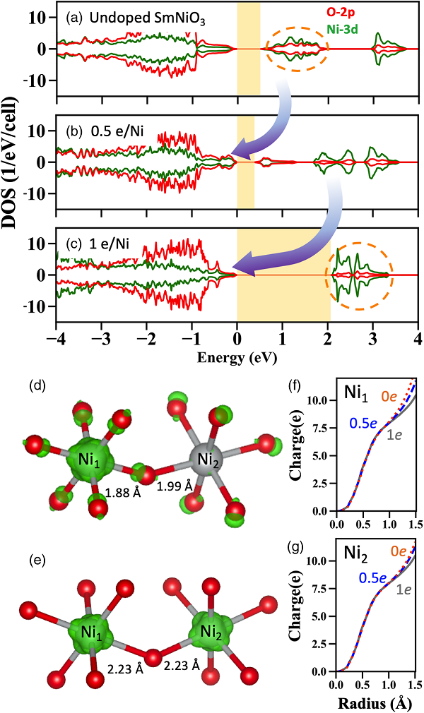 (a) (b) (c)SmNiO3的态密度,其中(a)未掺杂(b)0.5 e/Ni掺杂(c)1 e/Ni掺杂,箭头表示中间带的一部分在电子掺杂时被价带吞并。图(d)未掺杂和(e)掺杂1 e/Ni的中的绿色等值面表示未被占据的中间带波函数的模平方,O原子用红色标记。(f)(g)作为半径的函数,在小八面体(Ni1)和大八面体(Ni2)内以镍原子为中心的球体中积分的总电荷密度。