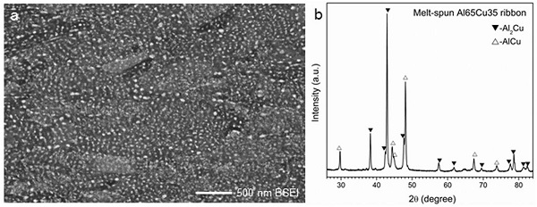 (b) XRD结果确定快速凝固Al65Cu35原始合金包含Al2Cu和AlCu两相