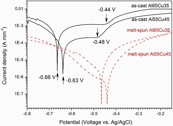 图五 快速凝固和铸造Al65Cu35和Al55Cu45原始合金的电化学性能