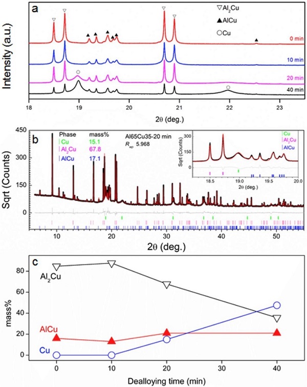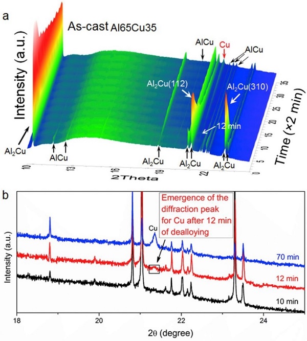 更高分辨率结果及精修分析显示Al2Cu的每个XRD峰的强度随着脱合金时间的增加而降低,而AlCu的强度不变,证实了Al2Cu和AlCu两相的顺序去合金化过程