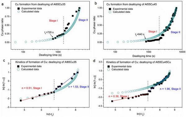 (c,d) 经典形核-长大理论(Avrami-Erofe’ev model)可以用来描述去合金化过程中纯Cu相的形成过程:Al2Cu的去合金化分为两个阶段,原位同步辐射结果以及经典理论在典型的纳米多孔结构扩散富集形成理论上增加了形核阶段,丰富和深入了去合金化机理
