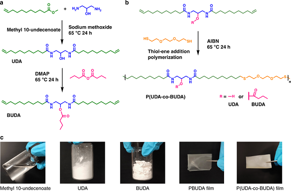 (c)10-十一碳烯酸甲酯、UDA、BUDA、PBUDA薄膜和P(UDA-co-BUDA)薄膜的成品照片。