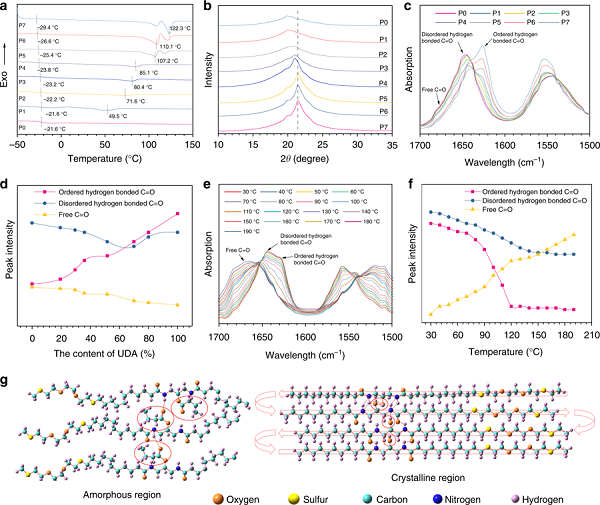 (d)作UDA含量的函数,P0-P7的游离/无序/有序氢键C = O的FT-IR峰强度的变化;
