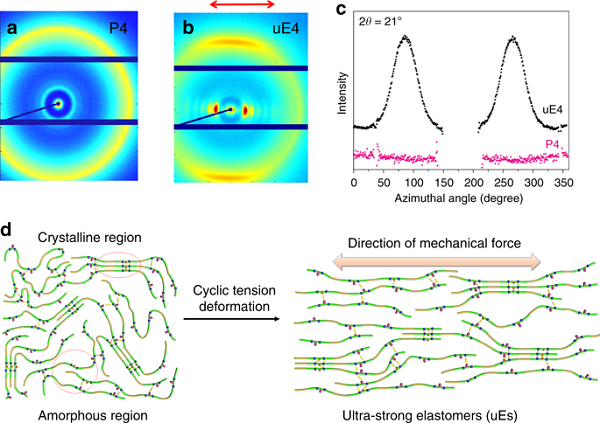 (a, b)P4和超强弹性体4(uE4)的二维(2D)广角X射线的衍射(WAXD)图案;