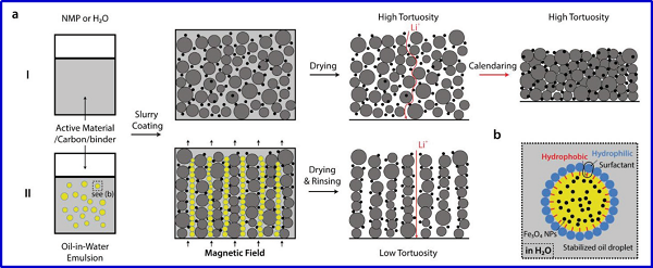 麻省理工学院的Yet-Ming Chiang教授就沿着第二条途径,开发了一个通用的,可扩大的制备具有低曲折度的厚电极的方法。作者将少量的油基磁流体加入到水溶液中来制备浆液。随后对浆液施加一定的磁场,在磁力的作用下,油滴将会竖直的排列,形成相隔几百微米的链状。经过洗涤和干燥就可以制备出具有竖直排列的多孔结构的厚电极,这些低曲折度的孔通道非常有利于离子的传导。采用该方法,作者制备出了厚度超过400 μm的电极,其面容量高达14 mAh cm-2, 而传统电极的面容量仅为2-4 mAh cm-2。(L. Li, R.M. Erb, J. Wang, J. Wang, Y.-M. Chiang, Advanced Energy Materials, 9 (2019);https://doi.org/ 10.1002/aenm.201802472)