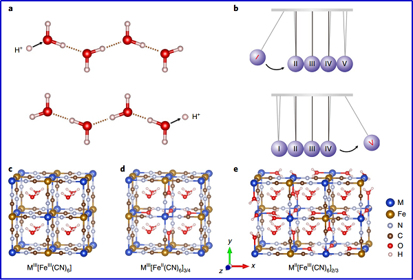 除此之外,人们还探索了一些其他新型储能体系。与双电层电容器相比,法拉第电池的电极通常难以具有超高的倍率性能和超长的循环性能。俄勒冈州立大学Xianyong Wu就报道了一种通过Grotthuss质子传导来弥补法拉第电池这种性能差距。质子的转移是通过协同解离和氢键网络中O-H键的形成来完成的。作者研究发现,在类似水合普鲁士蓝的化合物中有大量的晶格水分子,这非常有利于在氧化还原反应期间进行Grotthuss质子传导。当把这些材料用作电池的电极时,它们表现出了高达4000 C(380 A g–1)的高倍率性能以及73万全的循环性能。这也表明无扩散的Grotthuss拓扑化学的质子有着与需要离子在内部进行扩散的传统电池电化学不一样的反应机理。这也为高功率电化学储能器件的发展指明了方向。(X. Wu, J.J. Hong, W. Shin, L. Ma, T. Liu, X. Bi, Y. Yuan, Y. Qi, T.W. Surta, W. Huang, J. Neuefeind, T. Wu, P.A. Greaney, J. Lu, X. Ji, Nature Energy, 4 (2019);https://doi.org/10.1038/s41560-018-0309-7)