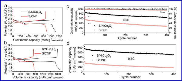 图3 采用钴酸镍和中空碳纳米纤维来负载硫正极的电化学性能对比图。