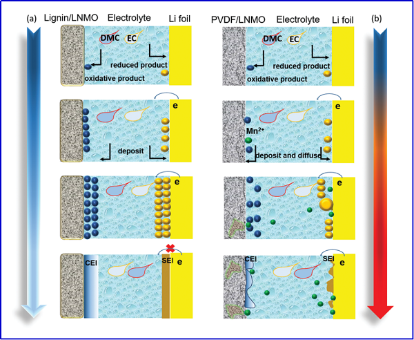粘接剂是电极的重要组成部分,它将活性物质,导电剂等材料紧密粘接在一起,并将其一起附着在金属集流体上。粘接剂对电池的电化学性能同样具有着重要的影响。相比于传统的仅仅起到粘接作用的粘接剂,现在人们着重开发出具有功能性的粘接剂,以期提高电池的性能。中科学的Yue Ma就开发出了一种新型木质素粘接剂。这种粘接剂除了具有一般粘接剂的功能,它所具有的酚基还可以消除正极界面在充电过程中产生的自由基,从而抑制自由基链式反应并可以在电极与电解液之间形成稳定的多维相界面。基于此,使用该粘接剂可以将传统的碳酸酯类的电解液的电压窗口扩展到5 V。研究发现,采用该粘接剂制备的LNMO 5 V电极表现出了比传统的PVDF粘接剂优异的多的循环稳定性。(Y. Ma, K. Chen, J. Ma, G. Xu, S. Dong, B. Chen, J. Li, Z. Chen, X. Zhou, G. Cui, Energy & Environmental Science, 12 (2019);https://doi.org/10.1039/c8ee02555j)