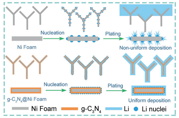 图5 金属锂在Ni泡沫和g-C3N4@Ni泡沫上的形核和沉积过程