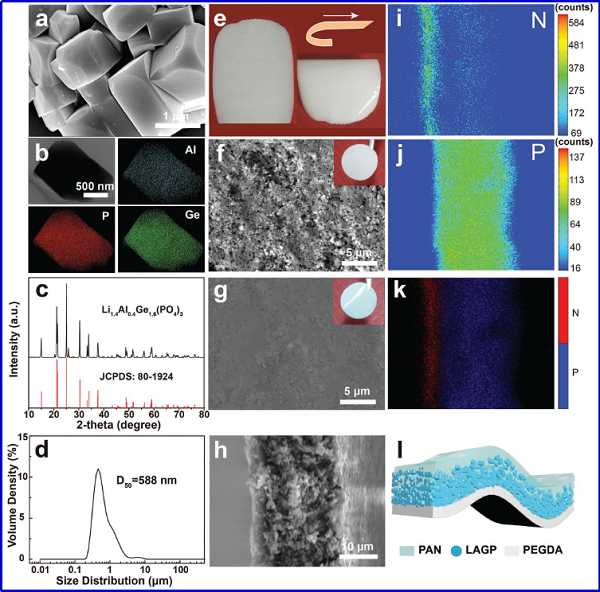 图6 (a-d)Li1.4Al0.4Ge1.6(PO4)3,(e-g)PAN@LAGP电解质和(h-l)PAN-PAN@LAGP电解质。