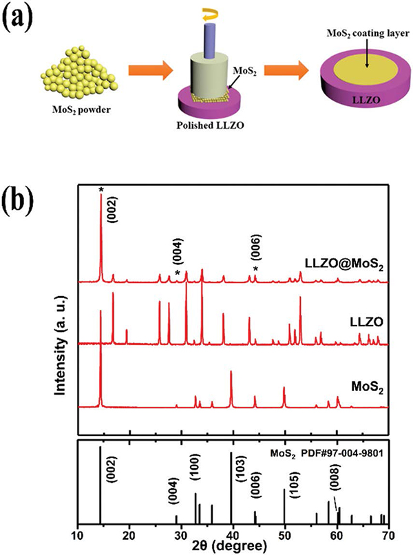 (b)MoS2粉末,LLZO粉末和涂有MoS2的LLZO片的XRD图谱