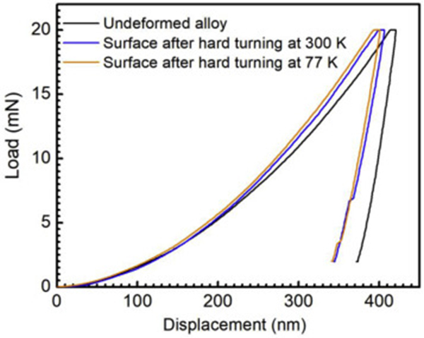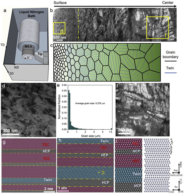 近日,美国橡树岭国家实验室郭炜博士后与贝红斌研究员合作,利用硬车削方法使NiCrCo中等熵合金(MEA)获得微观结构界面梯度,其中NiCrCo在更广泛的过渡金属元素组成的系列中表现出最佳的低温强度和断裂韧性的组合。研究表明,在材料进行低温硬车削之后,可以观察到纳米层状梯度结构,其是由在纳米级晶粒内部的密集的纳米层和hcp薄片组成。而且,77K硬车削后的结构梯度合金在2%初始应变下表现出高屈服应力(1.4GPa)和高应变硬化率(13.3)。该成果以题为” Shape-preserving machining produces gradient nanolaminate medium entropy alloys with high strain hardening capability “发表在国际著名期刊Acta Materialia上。