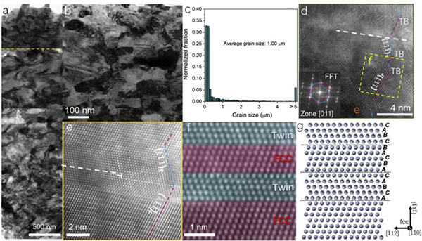 (d) 显示单个颗粒内高密度纳米孪晶的STEM图像;
