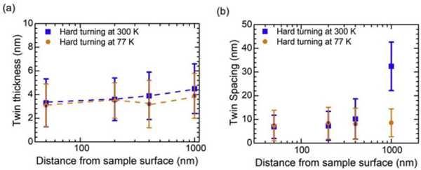 (b) 不同温度下硬车削MEA的纳米孪晶的间隔比较。