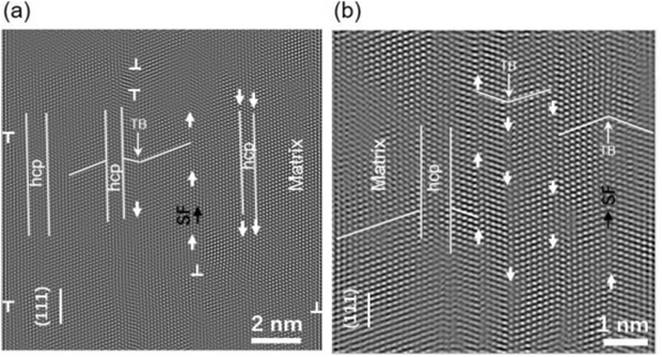 (g, h) 沿[110] fcc区轴单个纳米晶粒内部结构层次的高分辨率滤波STEM图像;