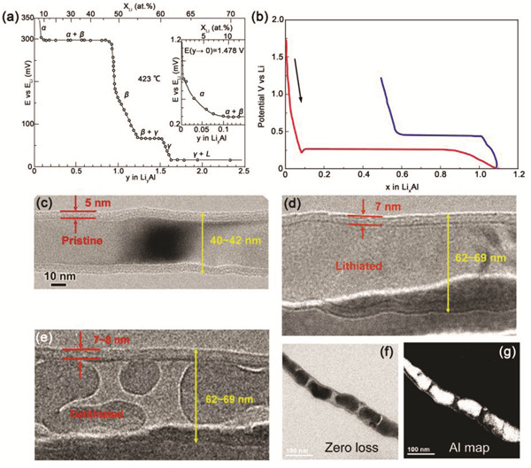 图 10 (a)锂-铝体系在423℃的库仑滴定曲线;(b)铝薄膜的恒电流图。在第一次循环期间Al纳米线的形态演变:(c)原始Al纳米线;(d)完全锂化的纳米线;(e)第一次脱锂后的纳米线;(f)三次电化学循环后的零损失图像;(g)Al的EELS图。