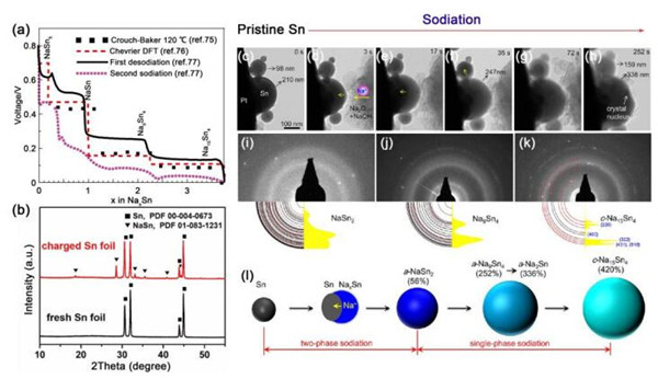 图 11 (a)30℃下,锡的第一次去除和第二次蚀刻的电压曲线;(b)Na离子的DIB中,完全充电的Sn箔的XRD图案;(c-h)在电化学处理期间,Sn纳米颗粒(NP)的形态演变TEM图;(i)当反应前沿扫过整个Sn NPs时,第一个a-NaxSn相的EDP;(j)与模拟的a-Na9Sn4相匹配的第二个a-NaxSn阶段的EDP;(k)第三a-NaxSn相的EDP,其基于体积膨胀被鉴定为α-Na3Sn相;(l)嵌钠期间Sn NP的结构演变的示意图。