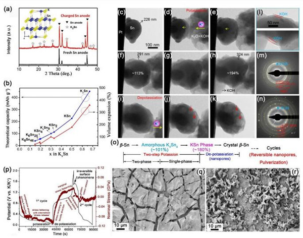 在室温下,平衡K-Sn相图呈现五个中间相,即K4Sn23,KSn2,K2Sn3,KSn和K2Sn。在K离子的DIB的情况下,可观察到不同的合金产品。在DIB中,Sn箔和膨胀石墨分别用作负极和正极。与新鲜的Sn箔相比,完全充电的Sn箔的XRD出现明显的K2Sn相峰(图12a)。如图12b所示,K2Sn相是K-最富相,最高的理论容量为452 mAh g-1。然而,相对较大的体积膨胀(~360%,图12b),降低了容量。对钾离子电池中的Sn NP进行了原位TEM表征,研究容量衰减机制。整个反应过程分为两个步骤:第一步(图12c-e)是一个典型的“两相”机制,第二步(图12f-h)是没有明显反应边界的“单相”反应。在第一步中,体积膨胀率约为113%,通过电子衍射分,比较测量的和理论的体积膨胀值,确定第一步结束时的无定形产物视为K4Sn9相。在去除电解过程期间(图12i-k),在KSn相内观察到纳米孔,随着去离子化的继续而生长得更大。图12o中给出了KIB中Sn纳米颗粒的反应机理图。反应过程中的机械稳定性,如图12p所示。组装过程中压缩应力积累,然后塑性变形或机械退化后,解除压力期间,应力反转到拉伸应力方向。