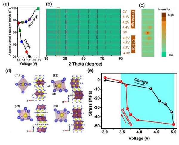 在在室温下,Ca-Sn相图中形成七种不同的Ca-Sn中间相,包括CaSn3,CaSn,Ca7Sn6,Ca31Sn20,Ca36Sn23,Ca5Sn3和Ca2Sn。很少有报道研究了Ca-Sn系统的电化学反应机理。最近,Sn箔为负极和石墨为正极的Ca离子DIB,分析了Ca-Sn系统的电化学反应机理。通过非原位XRD研究了Sn负极的合金化反应机理,如图13a-c所示。在充电期间(图13c),Ca7Sn6的(201)峰出现在4.0 V,然后,峰值强度随充电过程逐渐增加,并在充电结束时达到最大值(5.0 V)。在随后的放电过程中,峰值强度逐渐降低,在3.0 V时消失,表明合金化过程具有良好的可逆性。DFT计算不同环境下Ca7Sn6晶格中,Ca-Sn键的形成能量值均为负值,表明Ca7Sn6相热力学形成的可行性。另外,在充电/放电期间对Sn负极进行原位应力测量。如图13e所示,随着Ca-Sn合金化而产生的压缩应力进行,并且在4.34 V之前缓慢增加至-9.4 MPa,然后迅速增加至-48.13 MPa。在放电过程中,压应力随Ca-Sn去合金化而逐渐降低。在放电结束时,形成小的残余拉伸应力(2.7 MPa),这意味着在合金化期间Sn阳极的轻微塑性变形。应力主导电压范围(3.5-5.0 V)与电压平台一致,表明应力变化主要是由于合金化/去合金化。