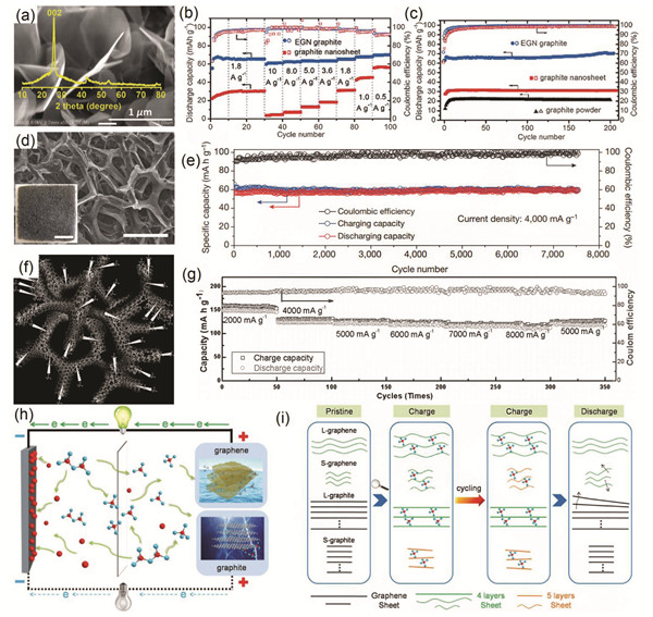 图 14 正极材料的纳米结构设计和阴离子的插层动力学研究:(a)纳米薄片EGN石墨的SEM图像;(b)倍率性能(2.25-5.0 V对Li/Li+);(c)200次的循环性能和库仑效率图(1800 mAg-1, 2.5-5-5.0 V vs. Li/Li+);(d)开放框架结构的石墨泡沫的SEM图像;(e)Al/石墨泡沫袋电池的长期稳定性试验;(f)高孔隙3D石墨烯泡沫中纳米带中AlCl4-阴离子嵌入/脱嵌的示意图;(g)2000、4000、5000、6000、7000和8000 mA g-1下,软包电池充电和放电的速率性能;(h)Al-石墨烯和Al-石墨电池的示意图(左),石墨烯和石墨电极的照片(右);(i)石墨烯和石墨电极中AlCl4–阴离子嵌入化学的示意图。
