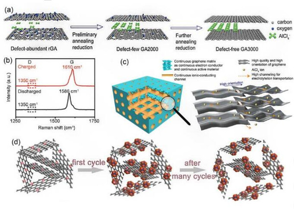 碳质正极的石墨化程度和结晶度影响离子扩散的结构稳定性,电子传导性,能垒和电极中阴离子的嵌入动力学。阴离子在石墨正极中的电化学嵌入过程,取决于石墨的物理性质,例如粒度和表面形态。大粒径可以增强石墨正极的结构稳定性,提高循环稳定性;但是降低比表面积并延长正极中阴离子的扩散路径,导致倍率能力相对较差。阴离子嵌入过程受反应动力学限制。片状结构能够促进TFSI–阴离子的嵌入。商业石墨纳米片,石墨粉和EGN石墨都具有可逆的TFSI–离子嵌入行为。但EGN石墨的比容量和倍率能力明显优于其他两种石墨材料(图14b-c),因为独特的纳米薄片构造的多孔结构可提供大的比表面积,有效地缓冲由阴离子嵌入引起的可能的体积膨胀。众所周知,增加缺陷的量可以产生更多的活性位点,然而,这将不可避免地增加阴离子扩散能垒,阻碍阴离子嵌入动力学。因此,调整缺陷和掺杂是增强阴离子插入碳质正极的动力学的重要策略。一种3000℃(GA-3000)退火的、高度结晶和无缺陷少层石墨烯气凝胶(GA)正极,如图15所示。GA-3000的无缺陷多孔结构,其提供低能量势垒,促进AlCl4–阴离子的快速嵌入动力学和电子的传输。对比研究表明,缺陷部位不能作为容纳嵌入的AlCl4–阴离子的活性位点。缺陷的存在导致电化学性能下降。因此提出了一种石墨烯正极的无缺陷设计:缺陷越少,电化学性能越好。 “三高三连续”(3H3C:高质量,高取向,高沟道;石墨烯基质的连续电子导体,通道网络的连续电解质/离子渗透方式,以及少量石墨烯骨架的连续活性材料)石墨烯薄膜(GF-HC)正极(图15c)。3H3C结构使正极具有增强的电子和阴离子的电化学反应动力学特征。