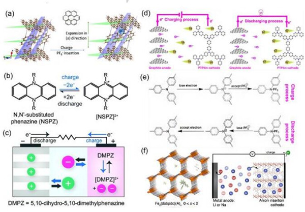 图 16 有机正极材料及其反应机理:(a)在加入六苯并苯正极时PF6–阴离子可能位点的示意图;(b)NSPZ的化学结构和氧化还原机理;(c)DMPZ作为p型正极的DIB中的能量存储的示意图;(d)PTPAn正极|KPF6|石墨负极的电池构造的DIB的机理;(e)充电-放电过程中,电子交换PTPAn分子;(f)Fe2(dobpdc)的结构框架和Fe2(dobpdc)的储能示意图。