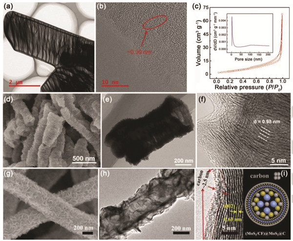 图 17 软碳的TEM图像(a)和HRTEM图像(b);(c)N2吸附-脱附的等温线和孔径分布(插图);(d,e)不同放大率退火后的MoS2/C纳米管的SEM图像;(f)退火后MoS2/C纳米管的HRTEM图像;(g)SEM图像和(h)(MoS2/F)@MoS2@C的TEM图像;(i)HRTEM图像的选定区域和(MoS2/F)@MoS2@C的示意图。