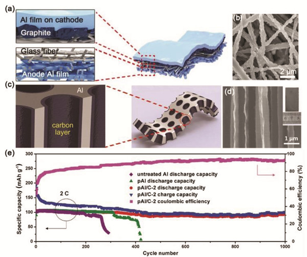图 18 (a)多孔铝膜为负极和集流体的双离子电池示意图;(b)负极Al膜的SEM形态(c)碳涂覆的多孔Al(pAl/C)负极的示意图;(d)碳涂覆的pAl的横截面SEM图像;(e)在2℃下,pAl/CGDIB的循环性能对比图。