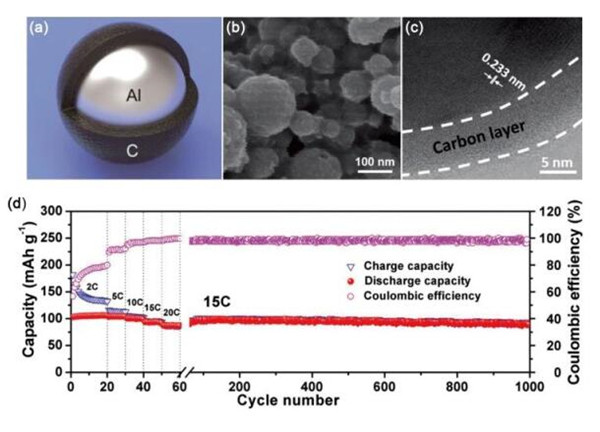 图 19 (a)Al纳米球(nAl);(b)碳包覆Al纳米球(nAl@C)的SEM形态;(c)nAl@Cnanospheres的HRTEM图像;(d)nAl@G DBI在15 C下循环性能图。