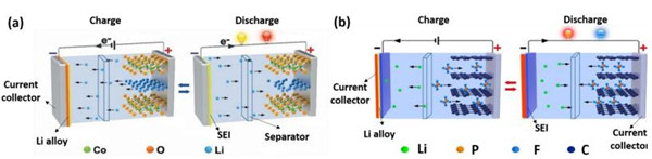 图 2(a)LIB和(b)双离子电池的充电/放电过程示意图。