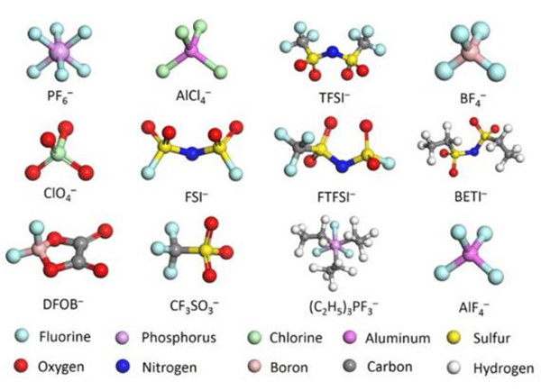 不同阴离子存在不同的插层效应,包括PF6–,BF4–,TFSI–和FTFSI–。研究发现DIB中的石墨正极中的阴离子的尺寸与电化学性能密切相关。阴离子嵌入石墨的起始电位具有以下降序:BETI–>FSI–>FTFSI–>FSI–/TFSI–>TFSI–>TFSI–/FSI–。20℃时,离子电导率,随着离子尺寸的减少而增加:BETI–<TFSI–<TFSI–/FSI–<FTFSI–<FSI–/TFSI–<FSI–,这意味着离子对形成和自聚集效应,主导了阴离子的电化学扩散过程。此外,插层能与石墨和插层剂(如PF6–和ClO4–)之间的电子转移密切相关,插层的电离势或电子亲和力与插入剂的大小相关,可以用来测量GIC的稳定性。