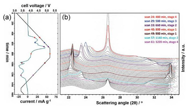 图 8 (a)循环伏安实验(第1次循环)的电池电压与时间和比电流与时间的关系曲线;(b)双离子电池的金属锂/KS6L的原位X射线衍射图谱。