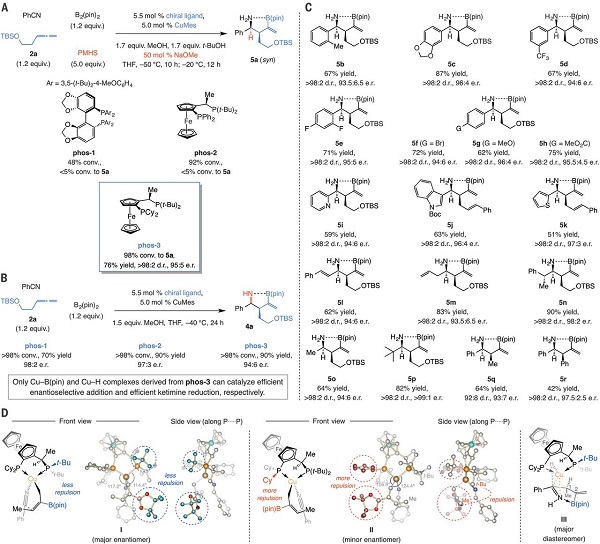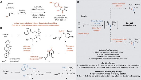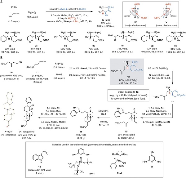 今日,Science最新报道了法国斯特拉斯堡大学的Amir H. Hoveyda教授(通讯作者)等人报道了通过对映选择性地添加碳基亲核试剂和对映异构体还原得到的酮亚胺,使得大部分反应活性不够的腈类化合物直接转化为多官能的无保护的烯丙基胺。成功的合成出来需要同时存在与之竞争的铜基催化剂,而较慢的形成和反应性较差的催化剂首先参与。通过加入非生产性的侧循环来解决该挑战,其中,这种侧循环由廉价的添加剂选择性地提供原料,以延迟活性更高的催化剂的功能。通过利用该方法高效的制备出抗癌药物(+)-白刺新碱突出了该方法的实用性。文章题目为“Delayed catalyst function enables direct enantioselective conversion of nitriles to NH2-amines”。
