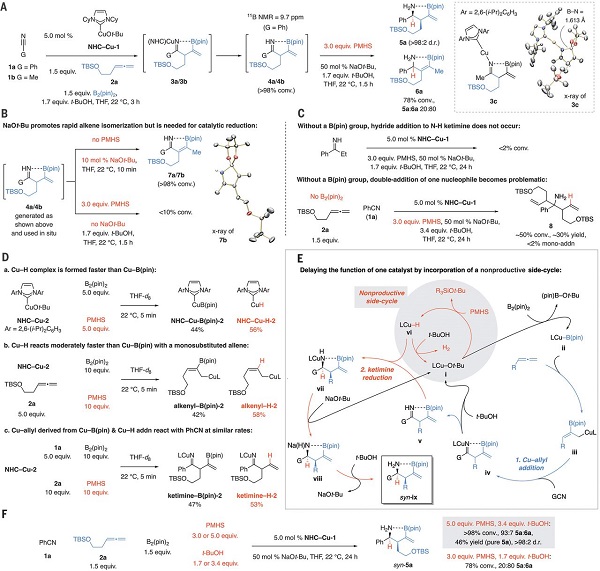 综上所述,作者通过直接使用廉价且易于获得的催化剂,并且无需任何保护和去保护的步骤,有效、立体地和对映选择性地制备多官能团烯丙基胺的能力,这将对具有生物活性的含N化合物的可实现性产生实质性的影响。同时,作者希望该方法适用于通过使用替代类型的有机铜化合物来合成其他类型的未保护胺。更重要的是,这可能是设计涉及多种催化剂的转化的第一步,其中它们需要进入催化反应的顺序不同于通过其固有反应性所预期的顺序。通过选择性地将其中一种催化剂与非生产性侧循环一起延迟来控制不同催化剂有效反应的顺序,这一概念可以在未来的反应开发研究中得到广泛应用。