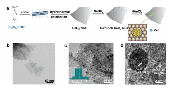 图1.a)含有不同浓度的Ce3+的Au-CeOx纳米片的合成过程;b) CeO2纳米片的TEM图;c) AuCe-47.3的TEM图 和金纳米颗粒尺寸分布;d)AuCe-47.3的HRTEM图
