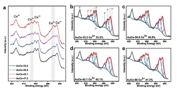 图2.a)Au-CeOx的XPS图;b)、c)、d)、 e) 分别为 AuCe-33.2、AuCe-35.5、 AuCe-43.1、AuCe-47.3的XPS图的拟合曲线
