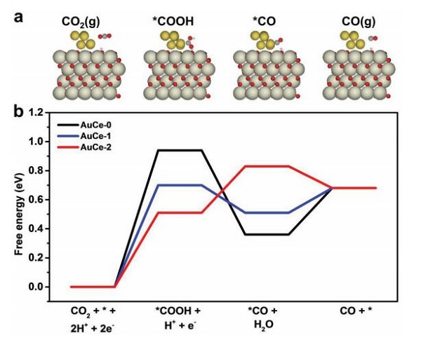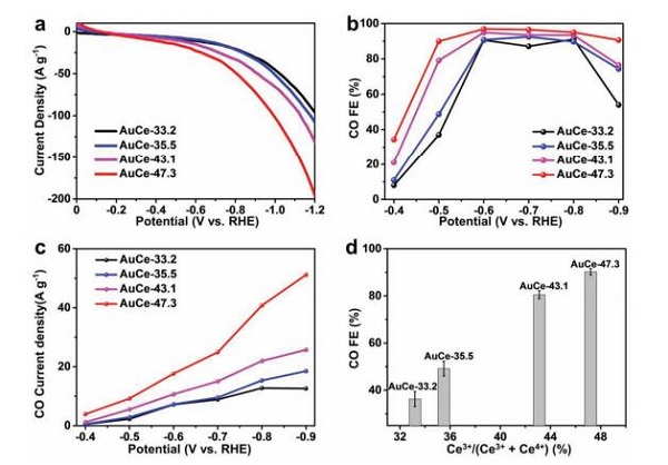 燃烧化石燃料使空气中有大量CO2,导致全球变暖。CO2电还原能减轻燃烧化石燃料的影响。然而,活化CO2需要过高的过电位,目标产物的选择性低。金对CO的选择性高,用于CO2电还原的过电位低。但是,金的成本高昂。负载金纳米颗粒是减少使用金的有效策略。尽管负载金纳米颗粒促进CO的生成,但CO法拉第效率和起始电压依然受限。最近,CeO2 通过促进CO2活化对提高CO2转化效率产生积极的影响。负载金纳米颗粒在 CeOx纳米颗粒上形成的体系的CO2电还原性能可以通过从Ce3+入手来提高。可是,Ce3+浓度和CO2电还原性能的关系还未被研究。