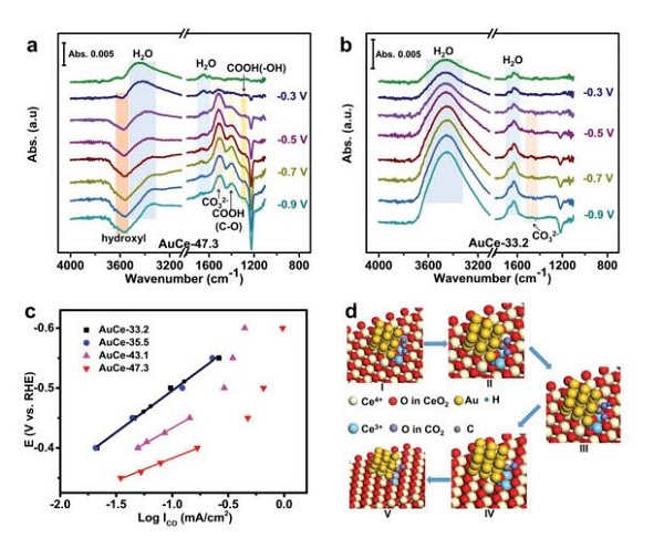 图4.a)、b)分别为不同电位下AuCe-47.3、AuCe-33.2 的ATR-SEIRAS谱图; c) Au-CeOx的塔菲尔斜率;d)AuCe-47.3参与CO2电还原的反应路线