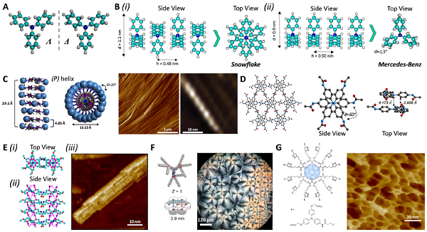 (E) TAA的双柱超分子堆叠:(i)俯视图(ii)侧视图和(iii)AFM图像