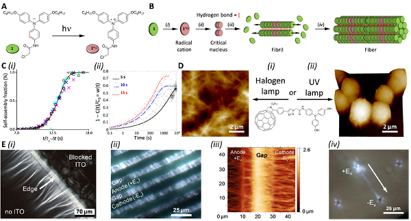 (D) (i)卤素光和(ii)紫外光促进富勒烯-TAA自组装,分别形成带状物和球形物的AFM图像。