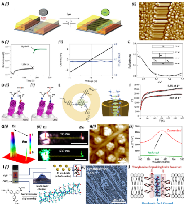 (H) (i)连接金纳米粒子的TATA纳米线制成混合薄膜,(ii)连接和未连接器件的光学导电性。