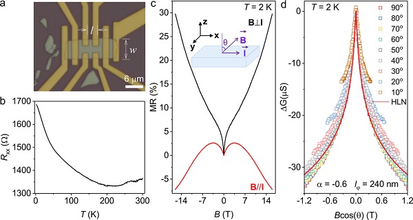 b) 不同温度下BSTS器件的磁电阻曲线,其中在T <50 K时可以观察到BSTS在低磁场下的WAL效应;