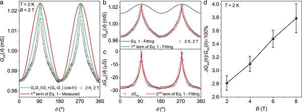 b) T = 2 K、B = 2 T时,BSTS器件纵向电导Gxx (黑色空心方块)随角度的变化,红色曲线是文中公式(1)拟合的结果,蓝色曲线是拟合得到的体态各向异性磁导。